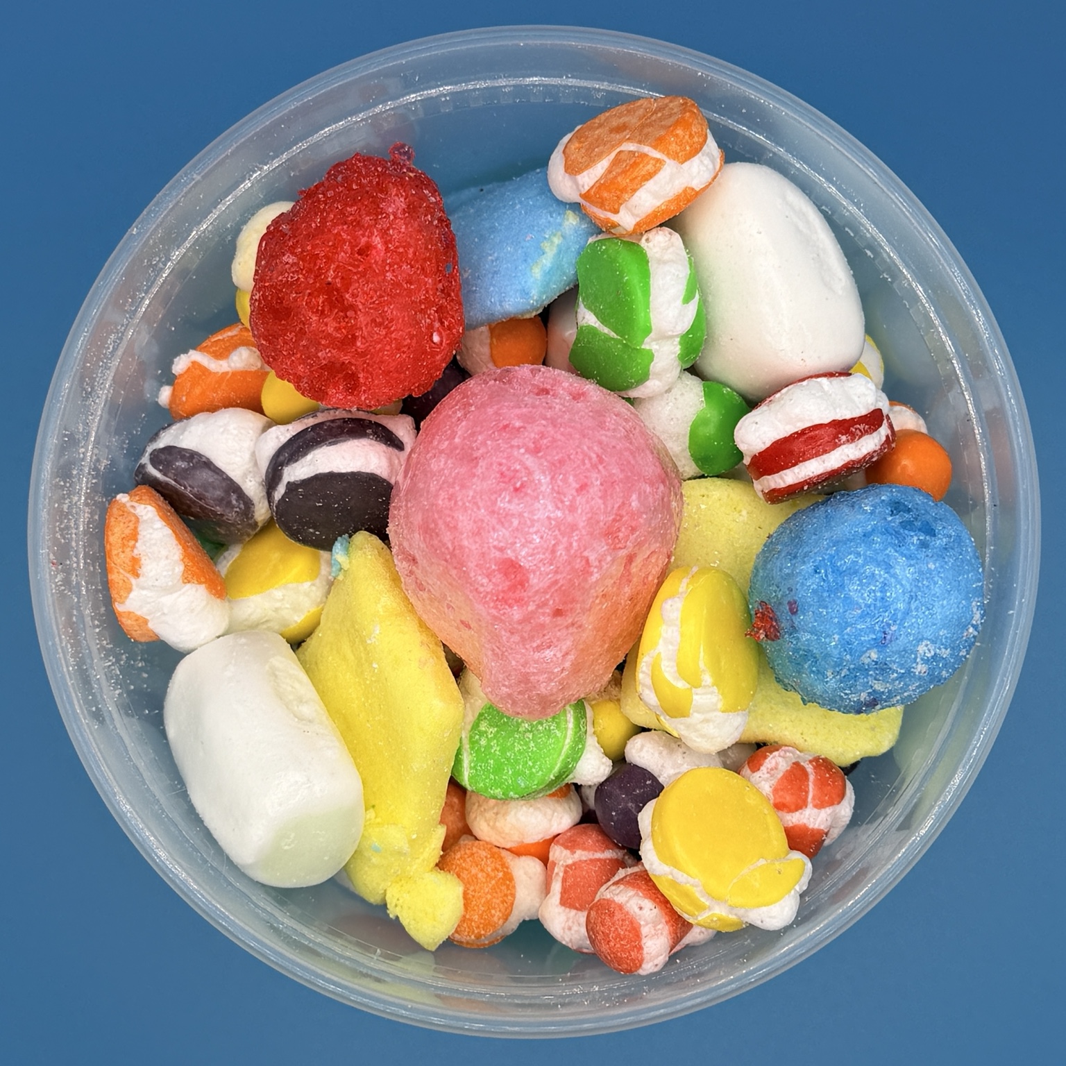 Freeze-dried chewy candy. Sometimes we have leftovers when we finish packing our products. This is the result of that. A random assortment of our candy products in a 32oz plastic tub. No two tubs are exactly alike, you never know what you’re gonna get!